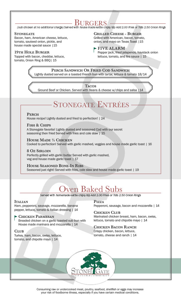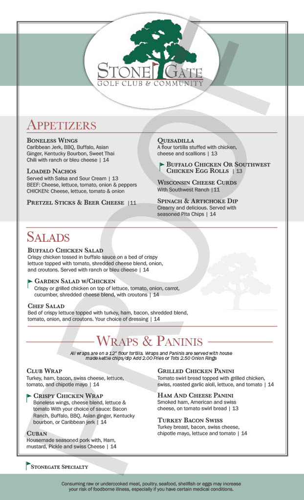 The Stonegate Bar & Grille is the perfect place to grab a bite to eat before, during, or after your round of golf. We feature a great menu that is sure to please every appetite. We are open every day and have many specials throughout the year. Whether you are out for a round of golf or just looking for a relaxing place to have breakfast, lunch, or dinner, please stop by and say hello!